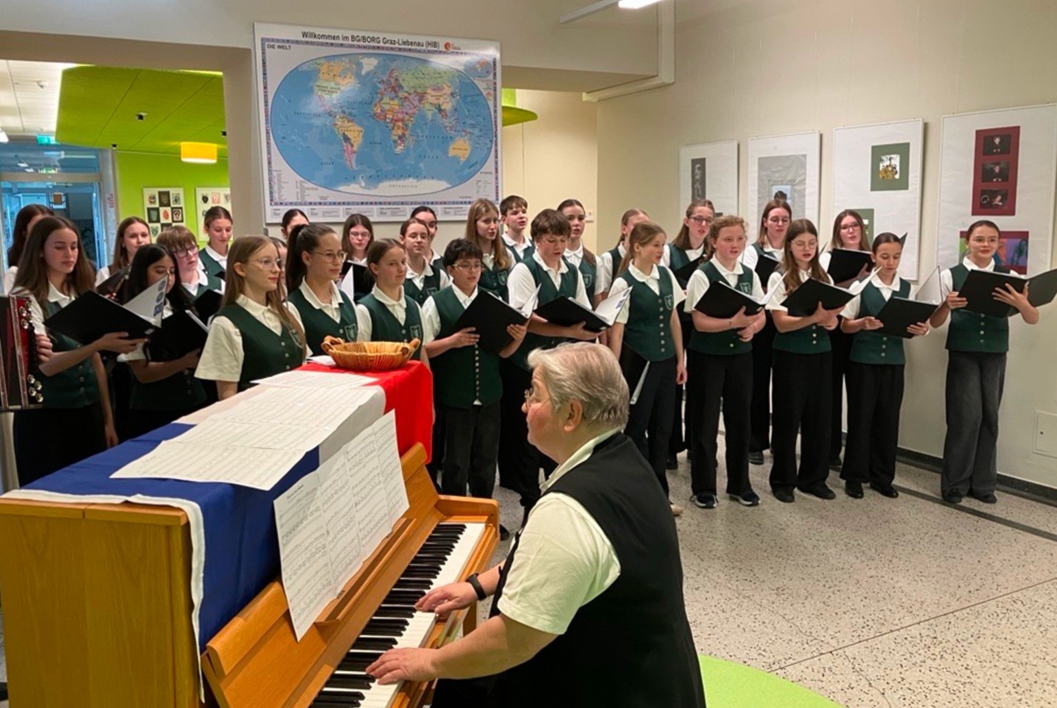 Dabei zeigte er sich sehr beeindruckt von der künstlerischen Darbietung unseres Schulchores: Unter der Leitung von Mag. Maria Fürntratt präsentierten die Sänger:innen zuerst einen „Steirischen Gruß“, gefolgt von zwei auf Französisch gesungenen Liedern aus dem Film „Les choristes“.