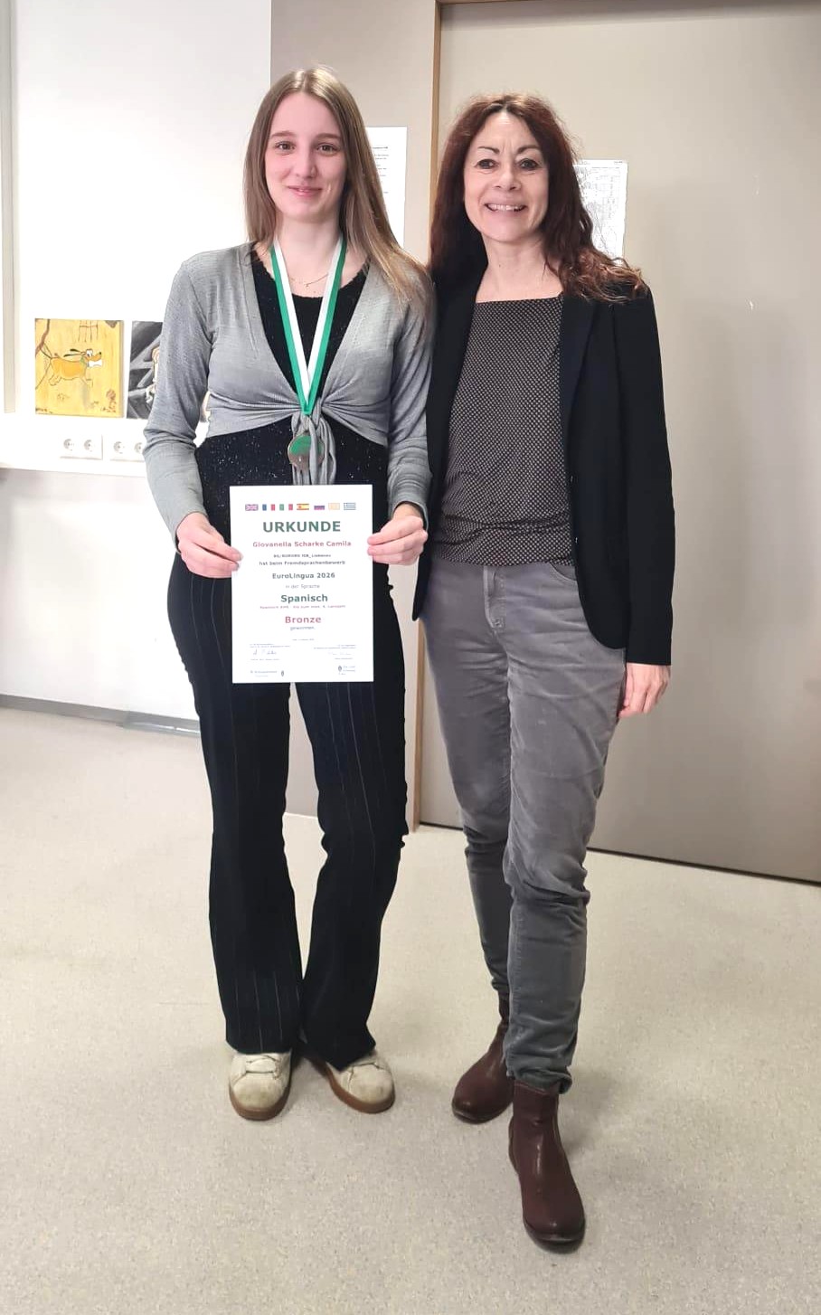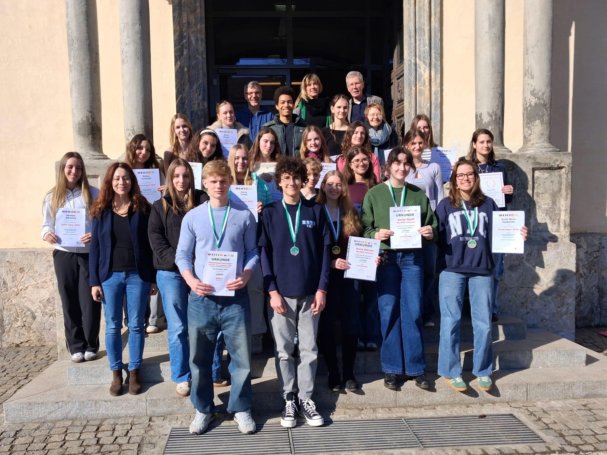 Beim diesjährigen Sprachenwettbewerb „EuroLingua“, der am 24.2. 2026 an der Karl-Franzens-Universität stattfand, waren unsere Schüler:innen äußerst erfolgreich. Sie stellten ihr Können in fünf Sprachen eindrucksvoll unter Beweis und wurden für ihre großartigen Leistungen mit Medaillen und Preisen belohnt. In Latein konnten Anna Steiner (8B) und Sarah Skoff (6C) in beiden Kategorien (6-jähriges und 4-jähriges Latein) jeweils eine Goldmedaille und den Landessieg erringen und sich für die Teilnahme an der Bundesolympiade qualifizieren. Maximilian Poggenburg (8B) und Marko Komlanov (8B) erhielten für ihre gelungenen Übersetzungen jeweils eine Silbermedaille. Maximilian wird ebenfalls zum Bundesbewerb entsandt.