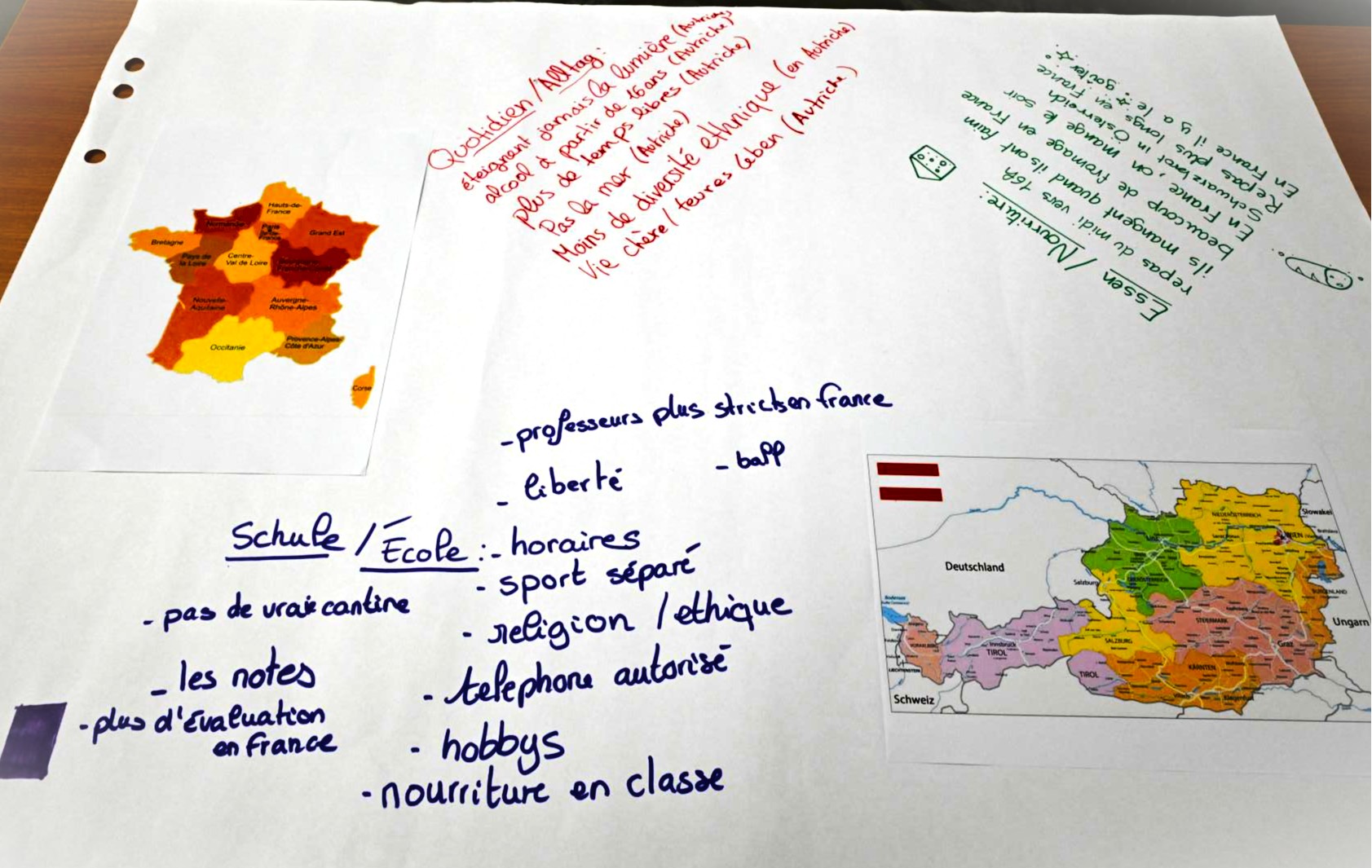 In der Schule können die Schüler in Österreich schon um 10 Uhr essen. Auch die Unterrichtsstunden sind unterschiedlich: in Österreich gibt es Psychologie und Religion, die gibt es in Frankreich nicht. Schließlich, die österreichischen Schüler sind religiös und in Frankreich sind sie weltlich.